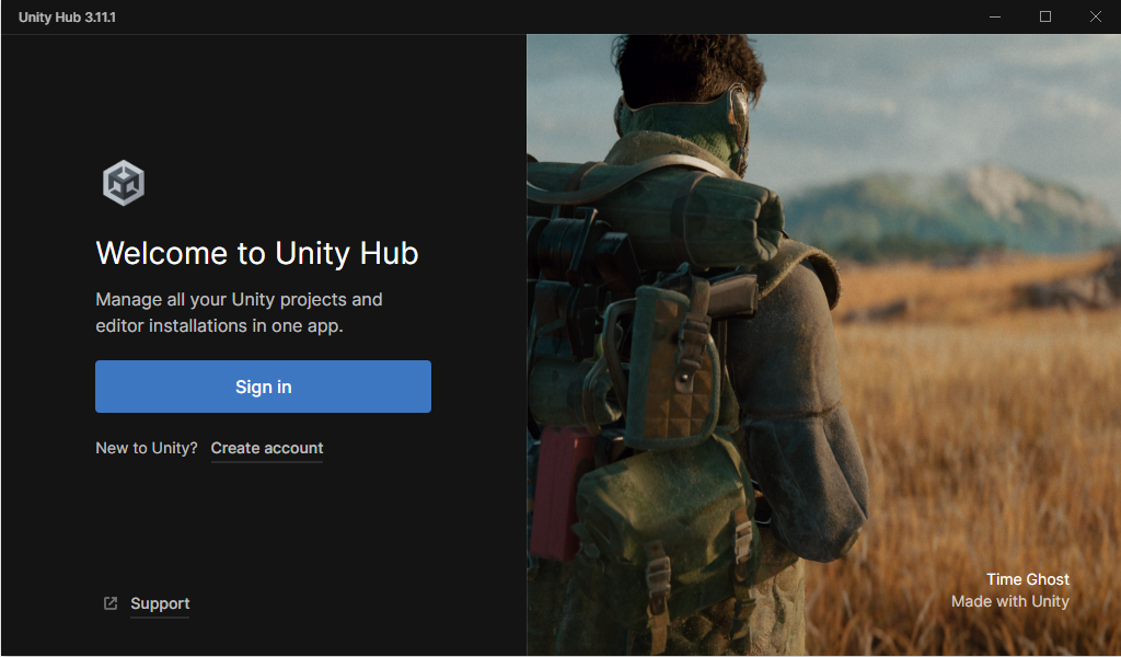 Unity Hub 실행 후 'Sign In' 버튼을 클릭해주세요.