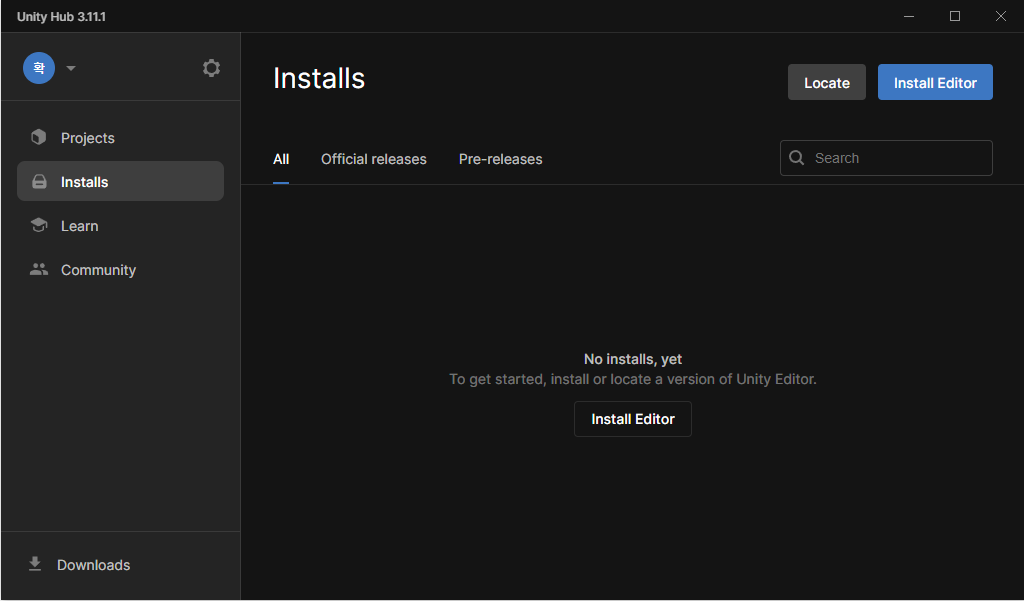 💡 Unity Hub는 유니티 버전 관리, 프로젝트 생성, 로그인 등을 모두 편하게 도와주는 앱이에요.