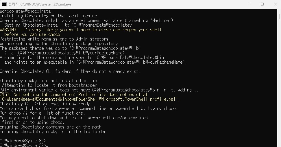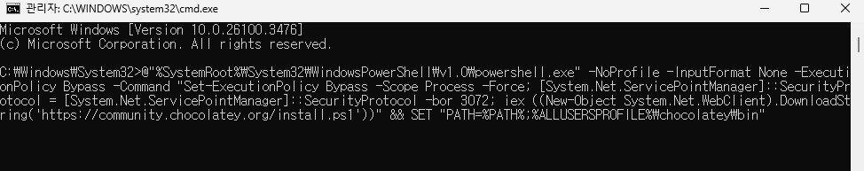 윈도우 CMD(Command Prompt)에서 Chocolatey를 설치하려면, 관리자 권한으로 CMD를 실행한 다음 아래 명령어를 입력하면 됩니다.(너무 길어서 아래 명령어 복사하시면 됩니다.)