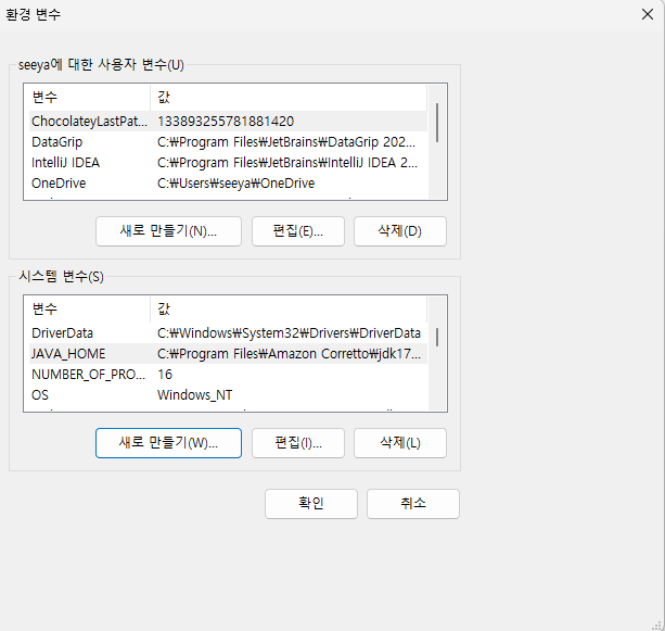 - 변수 값: C:\Program Files\Amazon Corretto\jdk17.x.x_x (Corretto가 설치된 경로)
